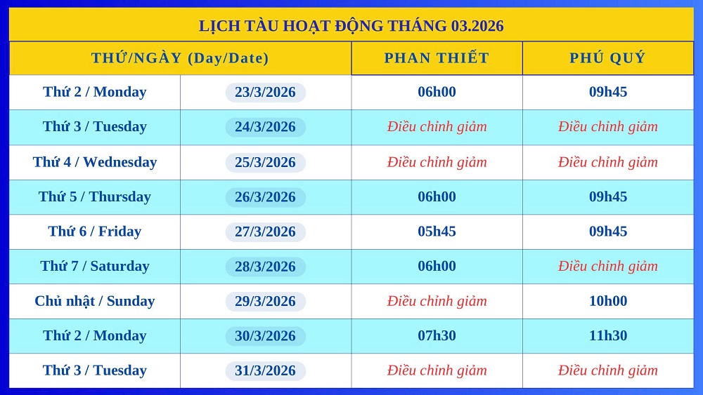 - Tuyến Phan Thiết- Phú Quý : Điều chỉnh giảm chuyến Ngày 24/03, 25/03, 29/03, 31/03/26